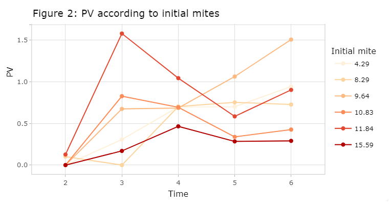 Our results suggest that the PV temporal dynamics within each colony differ according to the initial PV of the neighbor colonies, and that the infestation probability is higher for the lineal-middle disposition of the colonies.